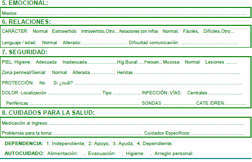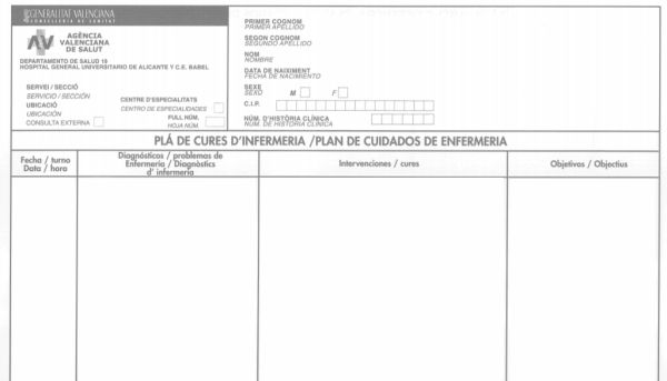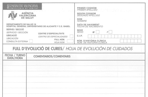 Aquest document té com a objectiu registrar les dades més significatives de l’estat de salut del pacient que requereixin intervenció infermera. En aquest document consten diversos apartats: a l’anvers es fa un registre i al revers un altre; cadascun amb la seva configuració.