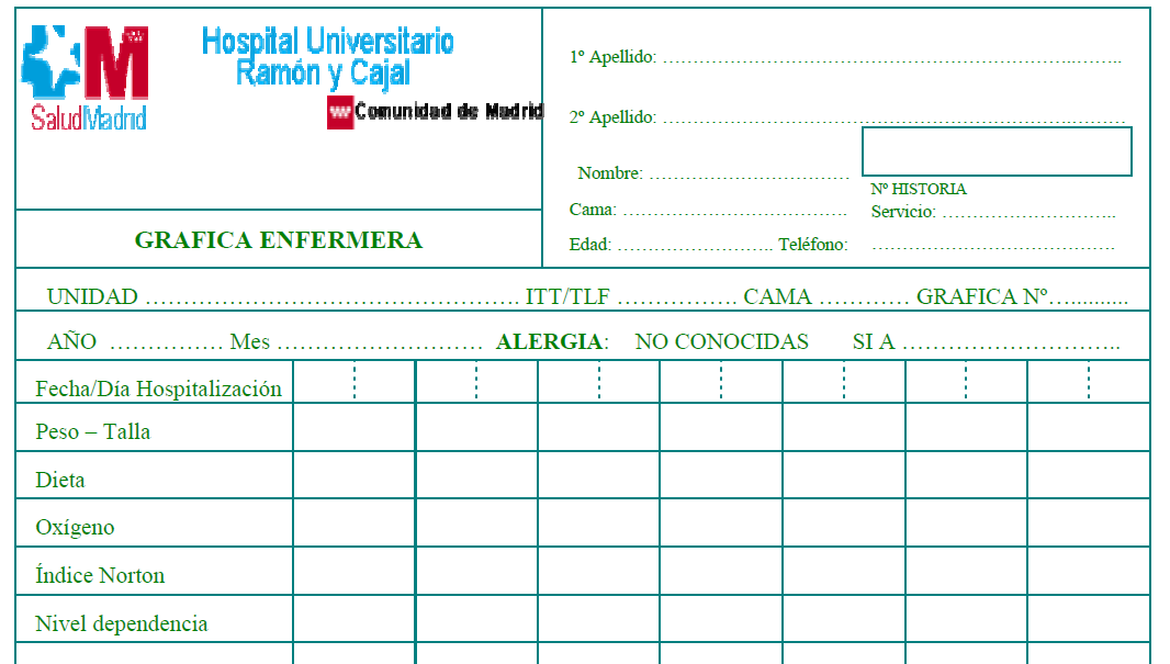 L’objectiu d’aquesta gràfica és registrar les constants vitals i balanç de líquids. En aquest document de registre trobem diversos apartats. Tant l’anvers com el revers tenen la mateixa configuració, excepte en la identificació del registre i de l’Hospital, que figuren en l’anvers.