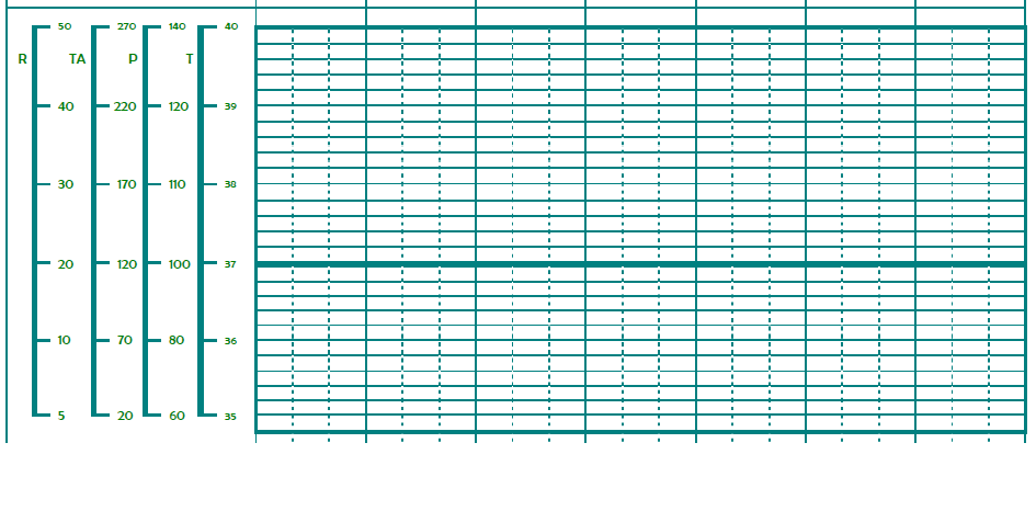 - Bloc: registre de les constants vitals. En l’espai mil·limetrat s’han d’anotar les constants prenent com a valors de referència les columnes en l’espai diferenciat a l’esquerra. Està subdividit cada dia en tres espais que corresponen als torns de matí, tarda i nit. No s’ha d’anotar cap constant en valor numèric. Compren: