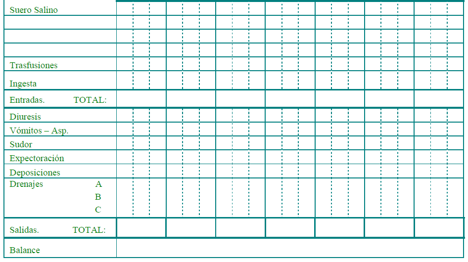 - Pèrdues: s’han de reflectir les sortides de líquids expressades en cc per les vies esmentades (vòmits, aspiració, diüresi, excrements i drenatges); en la suor, s’estima la pèrdua normal en 24 hores de 1.000 cc, en cas d’estar alterada es seguirà la següent regla: