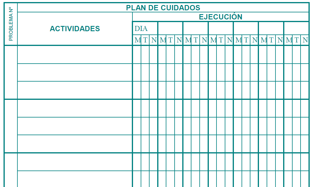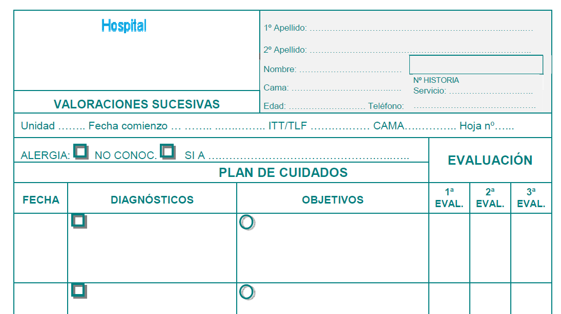 - Avaluació: es divideix en tres columnes de 1a, 2a i 3a avaluació. S’ha de reflectir la comparació de l’estat de salut del pacient i l’objectiu plantejat, anotant en el quadrat superior esquerre el núm. del problema que s’avalua i tot seguit la data, amb els dígits del dia, mes i any. També el torn en què es produeix l’avaluació amb els termes: MA = matí; TA = tarda i NO = nit. Per últim, al final del full, indicar: M = manté; A = augmenta; D = disminueix i R = resolt, per expressar l’avaluació de l’objectiu.