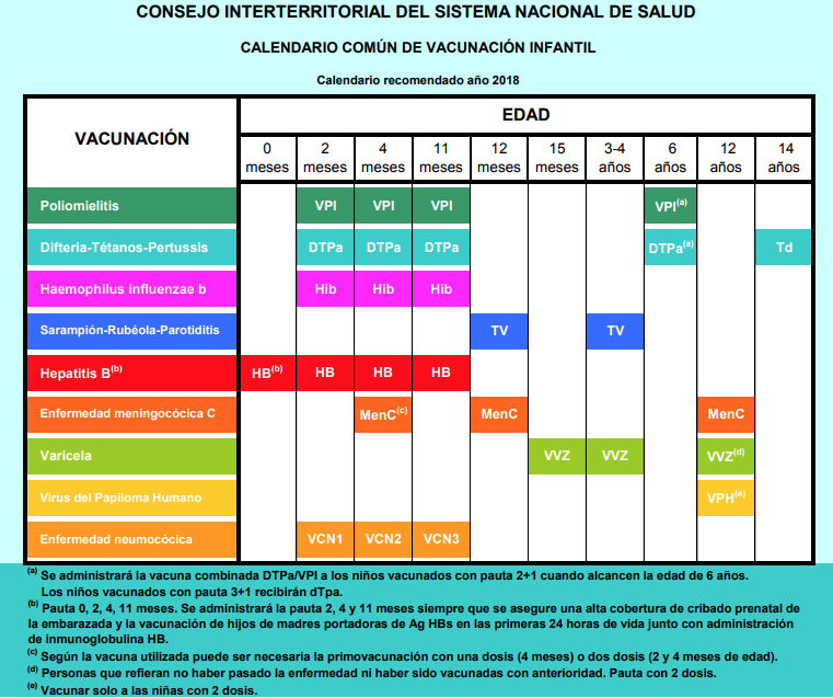 Aquest calendari inclou la prevenció de 14 malalties infeccioses (poliomielitis, diftèria, tètanus, tosferina, malaltia per Haemophilus influenzae b, xarampió, rubèola, parotiditis, hepatitis B, malaltia meningocòcica C, varicel·la, virus del papil·loma humà, malaltia pel neumococ i grip). En la figura podeu veure el calendari, actualment vigent, aprovat pel Consell Interterritorial del Sistema Nacional de Salut.