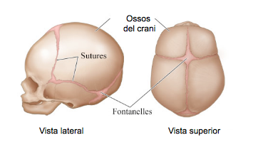 - Els ossos del crani estan separats entre si en les sutures, on s’observen zones de teixit membranós no ossificat anomenades fontanel·les, que s’ossifiquen amb el temps. Se’n palpen dues: una de posterior, més petita, que es tanca a les sis-vuit setmanes de vida, i una altra d’anterior, més gran, que es tanca a partir dels 12-18 mesos (vegeu la figura).