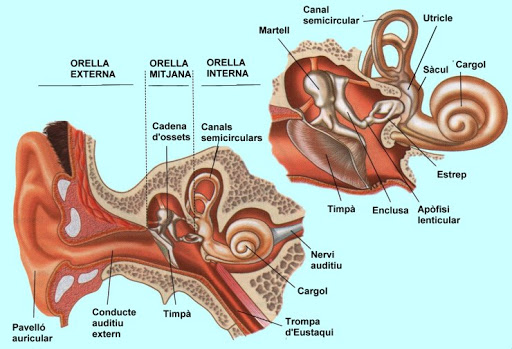Per estudiar el sistema auditiu en distingirem tres parts: l’orella externa, l’orella mitjana i l’orella interna: