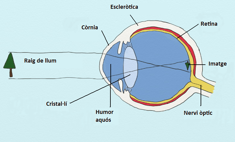 La llum que entra per la part òptica es refracta en un punt de llum sobre la retina on es produeix una imatge capgirada i més petita que l’objecte original. La retina envia la informació d’aquesta imatge gràcies al nervi òptic cap a l’encèfal perquè sigui interpretada (vegeu la figura).
