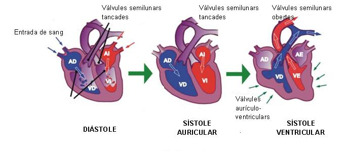 - Diàstole: les parets de les aurícules i els ventricles es relaxen i s’omplen de sang procedent de les venes. La sang que es troba a les artèries no retrocedeix gràcies al fet que les vàlvules semilunars (vàlvula aòrtica i vàlvula pulmonar) estan tancades. Aquesta fase dura aproximadament 0,35 segons.