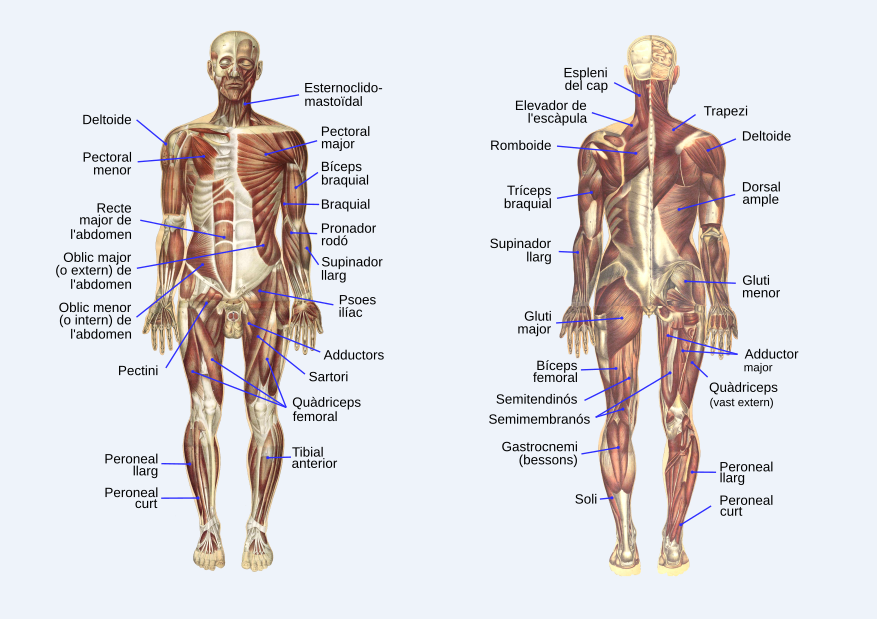 Els músculs estan formats per teixit muscular que s’insereix en els ossos, i és gràcies a la seva contracció que els poden moure. Hi ha tres tipus de teixit muscular: un llis (propi dels òrgans viscerals buits, com l’estómac, i dos estriats, el cardíac i l’esquelètic. Els estriats esquelètics són els que s’insereixen en els ossos a través dels tendons.