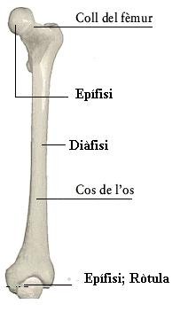 - Epífisi: cada un dels extrems, proximal o distal (més proper o més allunyat al tronc, respectivament), generalment ample i voluminós, que facilita l’articulació amb altres ossos.