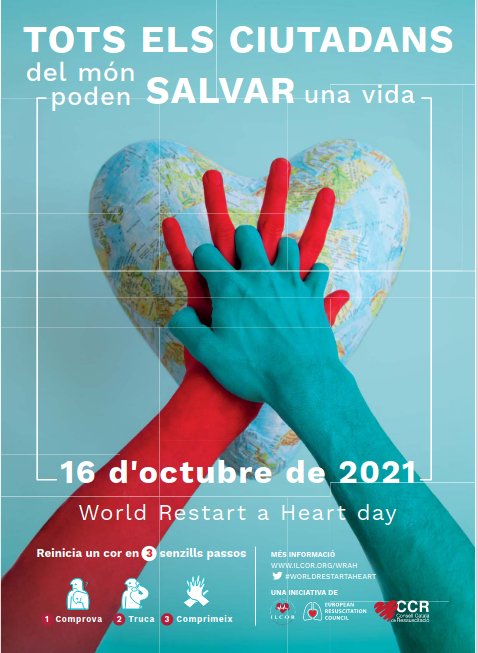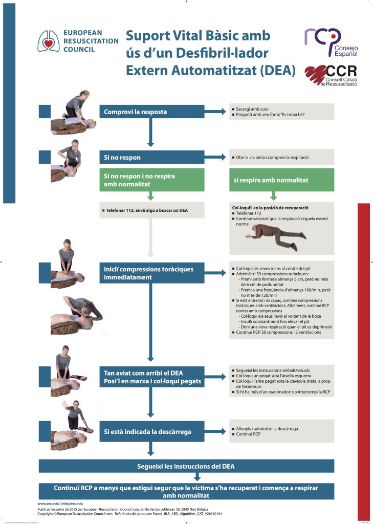 El suport vital bàsic en adults amb DEA és un dels principals algoritmes de l’European Resuscitation Council (ERC). Actualment, se segueixen els protocols i les especificacions de les Guies de l’ERC 2021. L’ERC publica fullets i pòsters (figura) per fer promoció del Dia Europeu de la Conscienciació sobre l’Aturada Cardíaca (el 16 d’octubre) amb diferents lemes, com ara “Tots els ciutadans del món poden salvar una vida” del poster de l’any 2021.