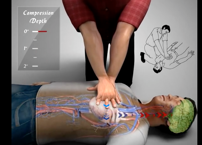 - S’ha de comprimir l’estèrnum cap a baix uns 4-5 cm, amb una freqüència aproximada de 100 vegades per minut.