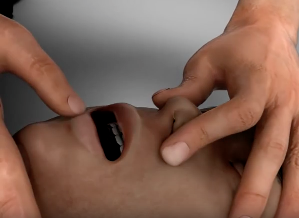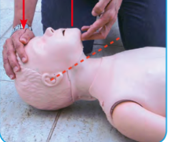 3. Obrir les vies aèries: s’ha de fer la maniobra front-mentó modificada, és a dir, posar una mà al front del lactant i inclinar-li el cap amb cura cap enrere; treure qualsevol obstrucció que es vegi sense fer fregament i posar el tou d’un dit de l’altra mà del socorrista sota la punta de la barbeta del lactant aixecant-la suaument.