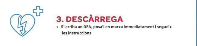 A més a més, actualment hi ha molts municipis on cada vegada és més freqüent comptar amb un desfibril·lador extern automàtic (DEA). En cas que hi sigui, sempre s’ha d’usar; les instruccions d’ús són molt senzilles i permeten guanyar temps, ja que amb l’RCP no n’hi ha prou per restablir el funcionament del cor.