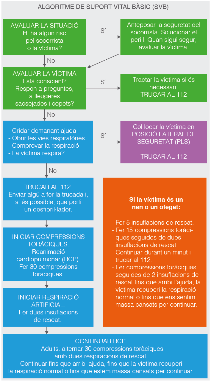 A la figura, podeu veure un altre grafisme divulgatiu sobre els passos del procés. I en el següent vídeo podeu veure tota la seqüència del suport vital bàsic en l’adult.