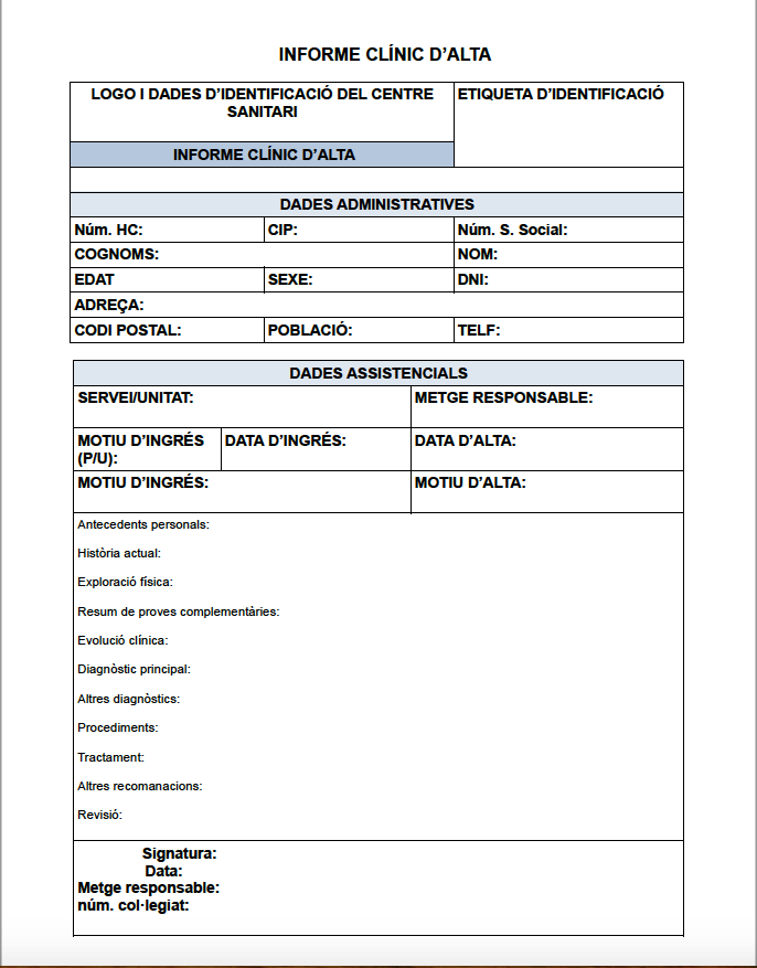 Quan una persona abandona l’hospital es produeix el procés d’alta, que pot donar-se per diferents causes. El pacient, en el moment de l’alta, ha de rebre un document anomenat informe d’alta hospitalària. Vegeu un model d’informe d’alta a figura. Aquest informe inclou les dades del pacient, el motiu d’ingrés, les dades diagnòstiques i els tractaments rebuts durant l’estada.