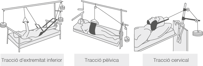 S’apliquen traccions diferents segons el lloc a tractar (vegeu figura): la tracció en una extremitat inferior, a la pelvis i a la zona cervical.