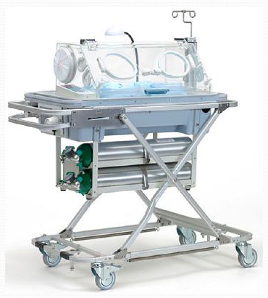 - Incubadora. És un llit a dins d’una cúpula de plàstic transparent que permet l’aïllament i alhora el control i observació del nadó. Disposa d’una sèrie d’equips que produeixen el millor entorn per al nadó, per tant, és l’habitacle que assegura unes condicions de vida i tractament als nadons prematurs o amb baix pes. Permet regular la temperatura, la humitat i la concentració d’oxigen a l’interior. També permet la manipulació del nadó des de l’exterior a través d’uns orificis dotats d’una mena de guants. Vegeu figura.