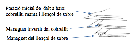 - Deixar lliures els extrems inferiors del llençol de sobre, manta i cobrellit i doblegar-los a sobre el llit, com si fos una volta o gira.