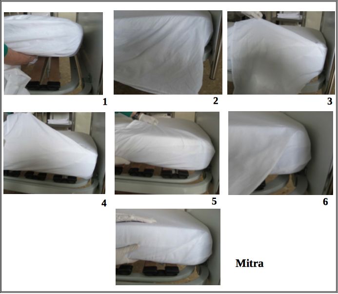 - Col·locar el llençol de sobre net sobre el pit del pacient i anar-lo estenent alhora que es retira el brut. No ha de quedar mai destapat. Ha de quedar roba sobrant a la part superior per poder veure la gira del llençol.