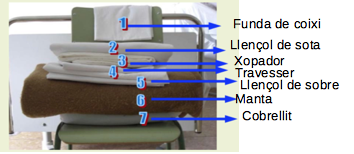 S’apila sobre una cadira en ordre invers al que s’anirà posant al llit. És a dir, a sota hi haurà l’últim element per posar al llit i al capdamunt de la pila hi haurà el primer element necessari per començar a fer el llit.