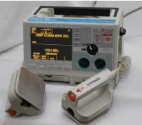Desfibril·lador. És un aparell que a través d’unes pales situades sobre el pacient li transmet una càrrega elèctrica per tal de restaurar l’activitat cardíaca quan aquesta es veu compromesa o falla totalment (vegeu figura).