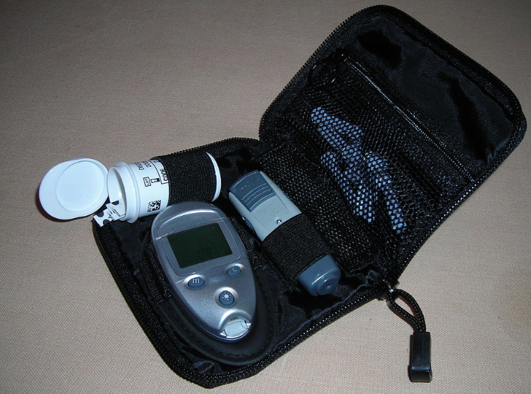 Glucòmetre. És un aparell òptic que serveix per mesurar la glucèmia en sang capil·lar de manera immediata (vegeu figura). La sang s’obté realitzant una punció al pacient amb una llanceta o un dispositiu de punció. S’obtenen una o dues gotes de sang amb la punció en un dit i s’impregna una petita tira que s’introdueix en el glucòmetre, que, pocs segons després, dona el valor de la glucèmia en la pantalla.