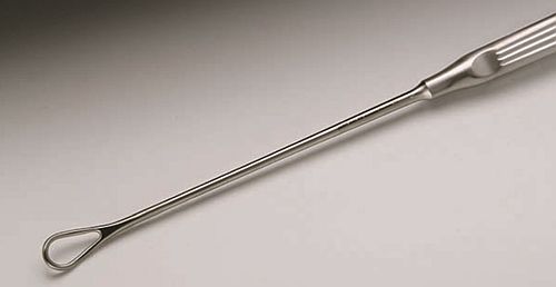 | Sonda acanalada | És un instrument llarg en forma de mig cilindre que s’utilitza per evidenciar el traçat de les fístules i fer el drenatge de les ferides i abscessos. | |