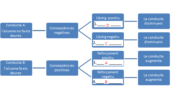 Abans de fer l’exercici repasseu l’apartat “B. F. Skinner i el condicionament operant o instrumental”, on hi trobareu una explicació detallada dels principis bàsics del condicionament operant com a tècnica per disminuir o augmentar conductes.