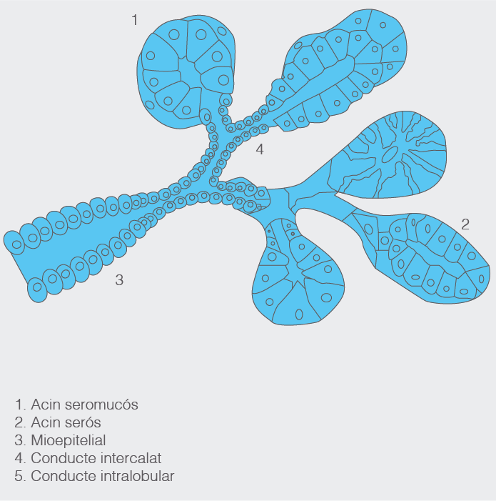 Les glàndules salivals s’encarreguen de produir la saliva. La saliva és un líquid amb múltiples funcions com lubricar la mucosa oral, facilitar la masticació i la deglució. La saliva conté enzims que duen a terme la fase inicial de la digestió de l’aliment i actua com a defensa contra les infeccions.