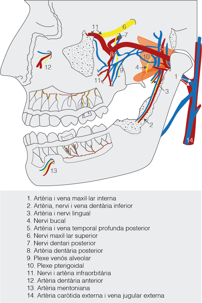 Els grans vasos que irriguen el cap són les artèries caròtides primitives, que es ramifiquen i aporten la sang arterial a aquesta regió del cos. D’entre aquestes ramificacions hi ha l’artèria maxil·lar interna, que aporta la irrigació als maxil·lars inferior i superior. El retorn venós va reunint les branques procedents de les estructures bucals fins a la vena jugular, que porta la sang venosa de retorn. Vegeu amb detall la figura: