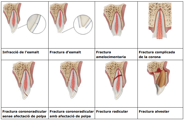 - Fractura d’esmalt: fractura limitada a l’esmalt amb pèrdua d’estructura dental.