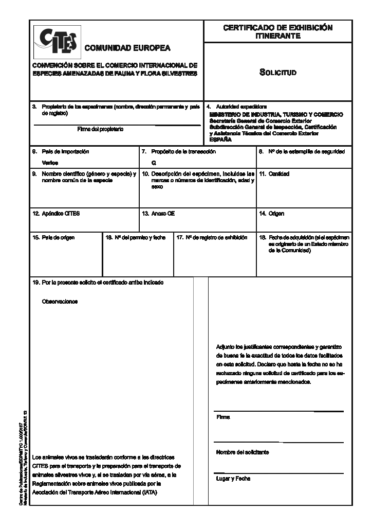 El Certificat CITES és necessari per importar a la Unió Europea espècimens d’espècies incloses en els annexos A o B del reglament (CE) 338/97. En podeu veure un model a la figura.