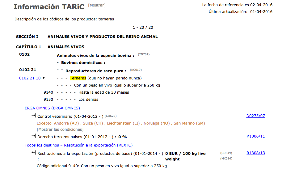 Busquem al cercador de codis TARIC i comprovem, tal com podeu veure a la figura, que la partida es correspon amb “Vedelles” i que des de l’1-04-2012 necessiten un control veterinari previ a la importació.