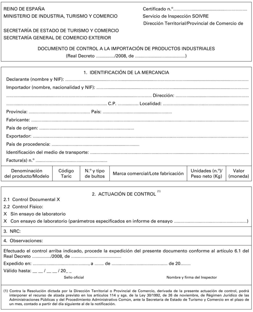 - Certificats de conformitat amb les normes de seguretat aplicables a la importació de productes industrials de consum com tèxtils, calçat o joguines.