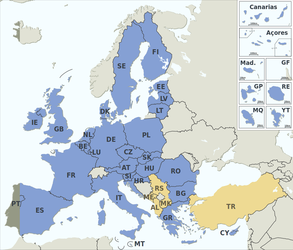 Tots els països fronterers de la UE seran o poden ser duana de sortida i/o partida i d’entrada, així com les sortides des d’un aeroport també ho seran. Si observeu el mapa de la figura, veureu que aquests països són: Alemanya, Bèlgica, Bulgària, Croàcia, Dinamarca, Eslovènia, Eslovàquia, Espanya, Estònia, França, Finlàndia, Grècia, Hongria, Itàlia, Letònia, Lituània, Malta, Països Baixos, Polònia, Regne Unit, Romania, Suècia i Xipre.