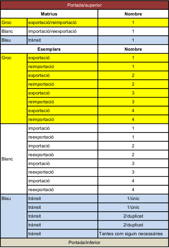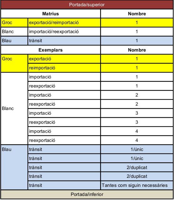 - Full blau: per al trànsit. El trànsit permet la circulació de mercaderies entre dues oficines de duanes d’una mateix territori duaner, a partir d’una oficina interior a una oficina de la frontera i al revés (trànsit intern); i entre dues oficines frontereres (trànsit extern).