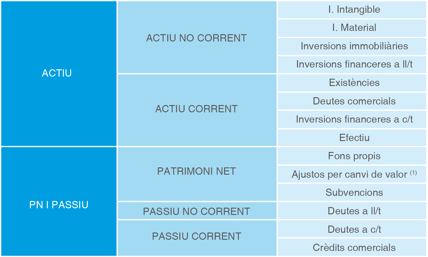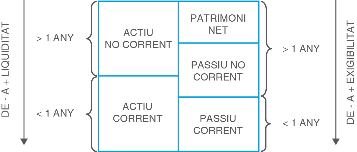 - Comptes de balanç (representen el patrimoni net, els actius i els passius).