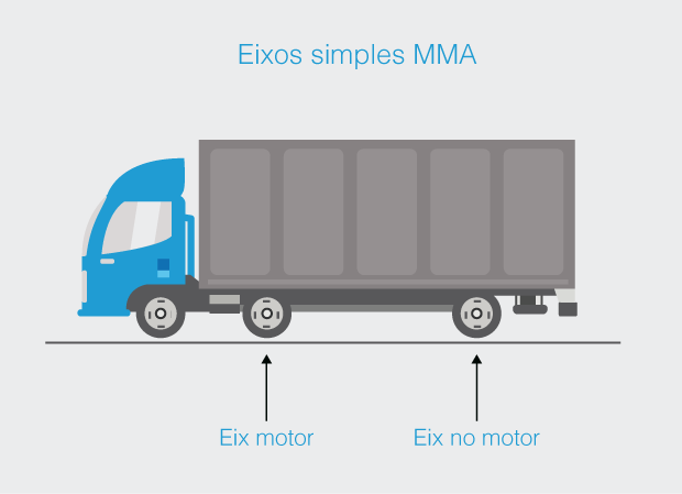 - Eix simple. S’anomena eix simple l’element constituït per un sol eix no articulat amb cap altre. Pot ser motriu o no motriu, direccional o no direccional i, en funció de la posició, anterior, central o posterior. A la figura es poden veure diversos eixos simples: eix direccional a la posició anterior sota la cabina, central (eix motor) i eix simple no motor a la part posterior.