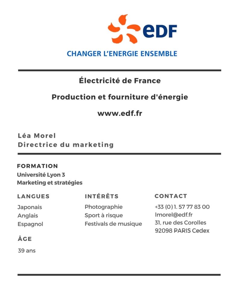 – Parlez-moi de Mme.Morel. Quelle est sa fonction chez Électricité de France ?