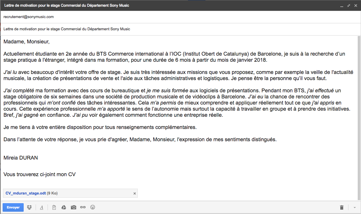 Voici un exemple de lettre de motivation pour un stage. Faites attention aux formes verbales au passé composé en italique :