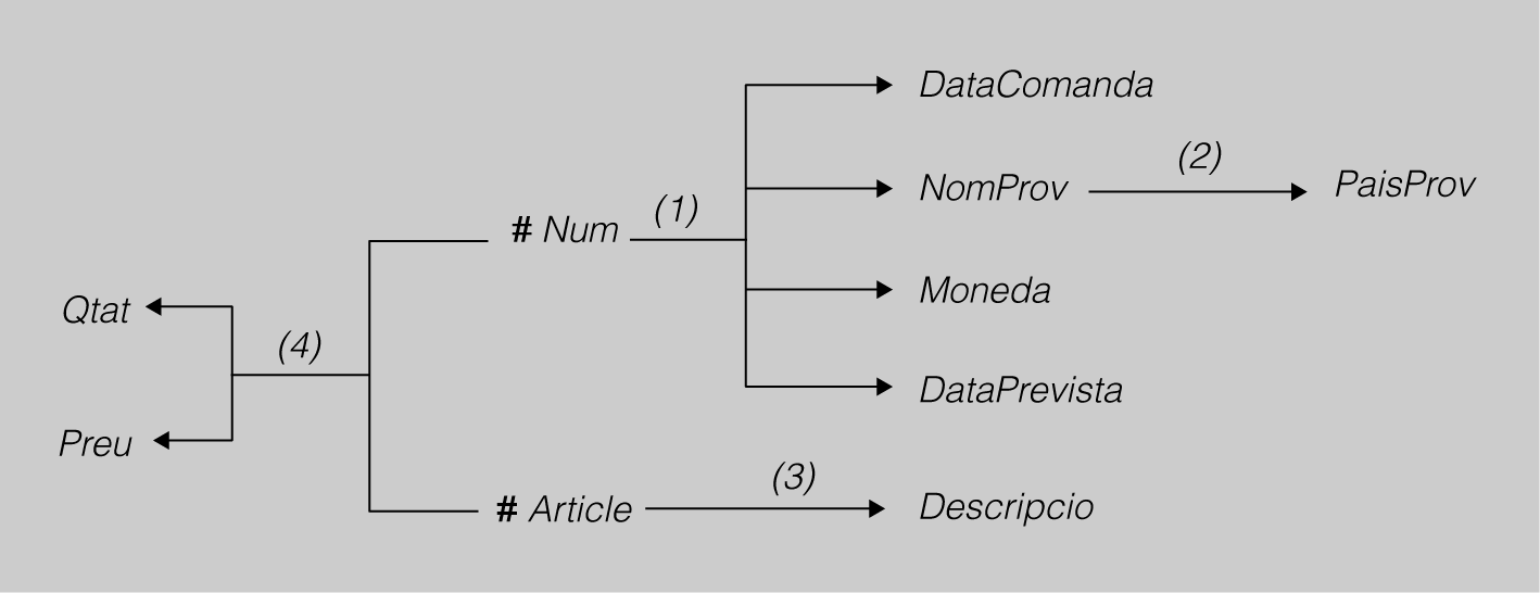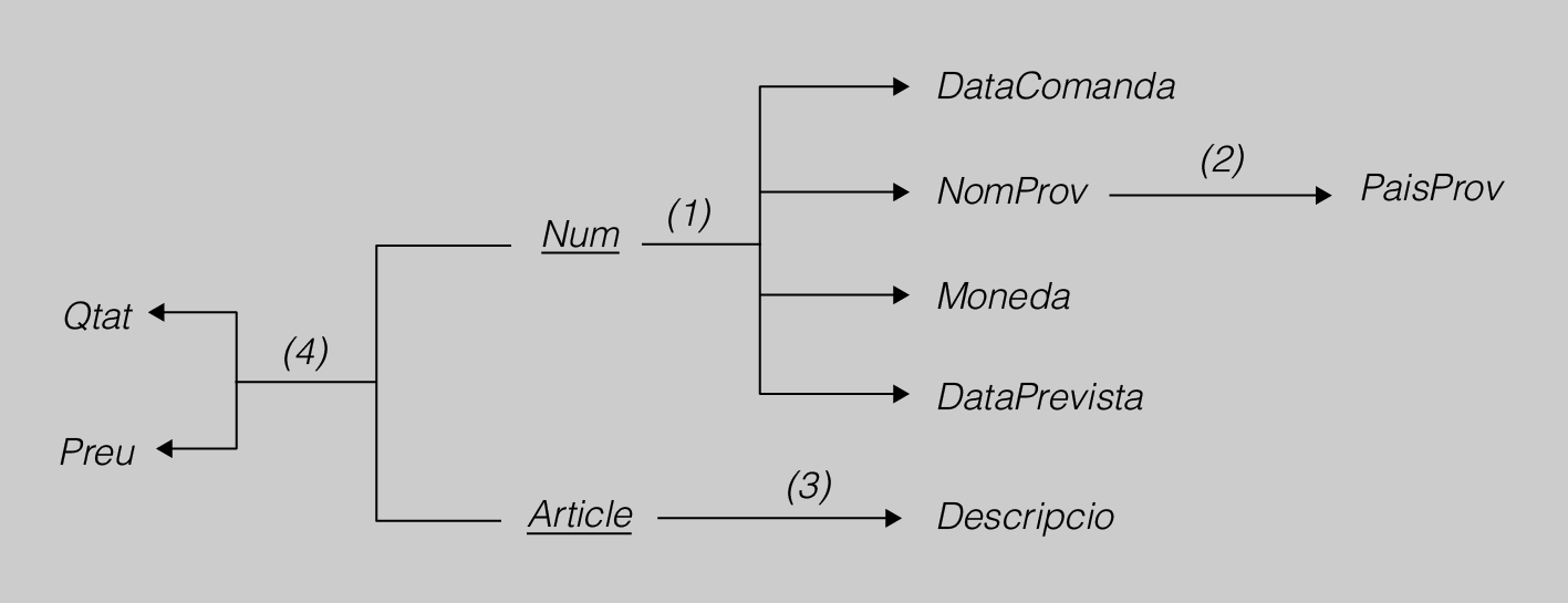 En aquest esquema, es poden veure les dependències funcionals entre els atributs. Es veu que DataComanda, NomProv, Moneda iDataPrevista depenen funcionalment (1) de Num, que PaisProv depèn funcionalment (2) de NomProv, i que Descripció depèn funcionalment (3) d’Article. Així mateix, QtatiPreu depenen funcionalment (4) de Num i Article.