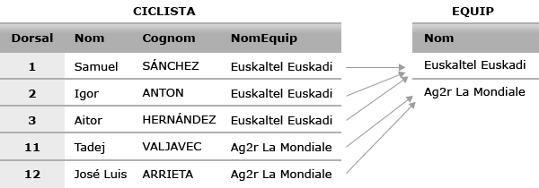 Construïu un fitxer per emmagatzemar ciclistes (amb els atributs Dorsal, Nom, Cognom i NomEquip) i un altre per a emmagatzemar equips (només amb l’atribut Nom). Poseu-hi alguns valors d’exemple (només 2 equips i 5 ciclistes), relatius a l’edició de la Vuelta 2009, i indiqueu, mitjançant fletxes, les interrelacions existents entre les entitats instància d’un fitxer amb els de l’altre. Podeu consultar les dades relatives a l’edició 2009 a les següents webs: http://www.lavuelta.com/09/ i http://es.wikipedia.org/wiki/Vuelta_a_Espa%C3%B1a_2009
