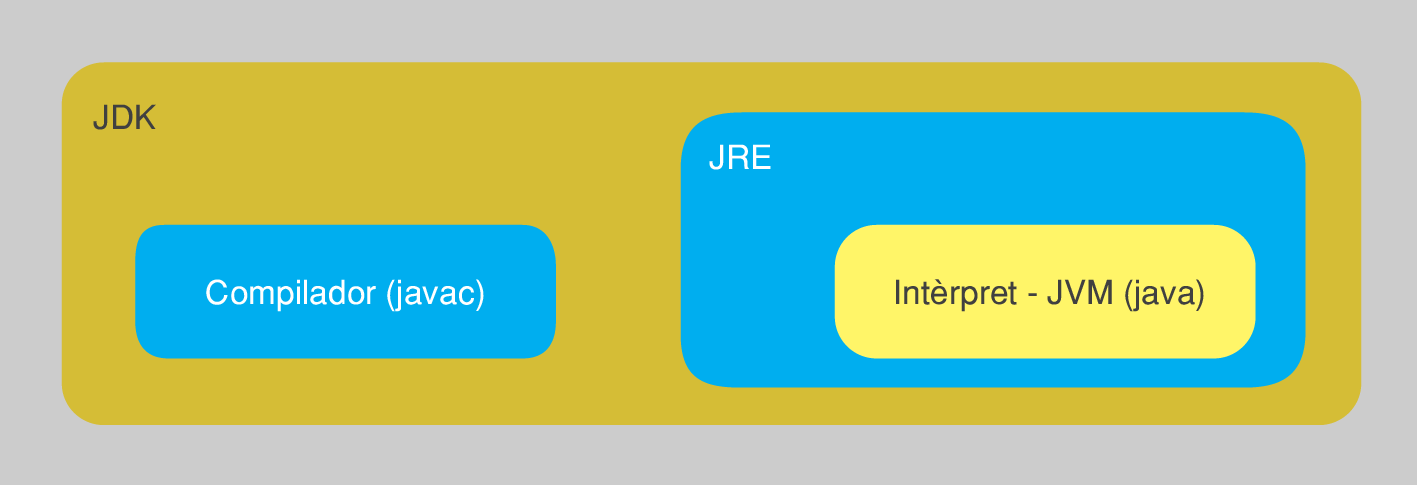 Un cop disposem del fitxer amb bytecode, aquest només pot ser executat amb l’ajut de l’intèrpret de Java, conegut popularment com la JVM (Java virtual machine, màquina virtual de Java). Aquesta s’inclou dins el paquet anomenat JRE (Java runtime environment, entorn d’execució de Java). Alhora, el JRE ja va incorporat automàticament dins del JDK. La figura mostra un esquema de la relació entre eines incloses als diferents paquets per al desenvolupament i execució de programes en Java.