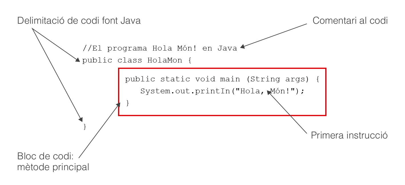 Aquest mètode principal engloba totes les instruccions del programa dins d’un bloc d’instruccions, entre claus, {…}. Abans de les claus hi ha un seguit de text que s’ha d’escriure exactament tal com es mostra. Si no, l’intèrpret de Java serà incapaç de trobar-lo i d’iniciar correctament l’execució del programa. Concretament, dirà que “No troba el mètode pricipal” (main method not found).