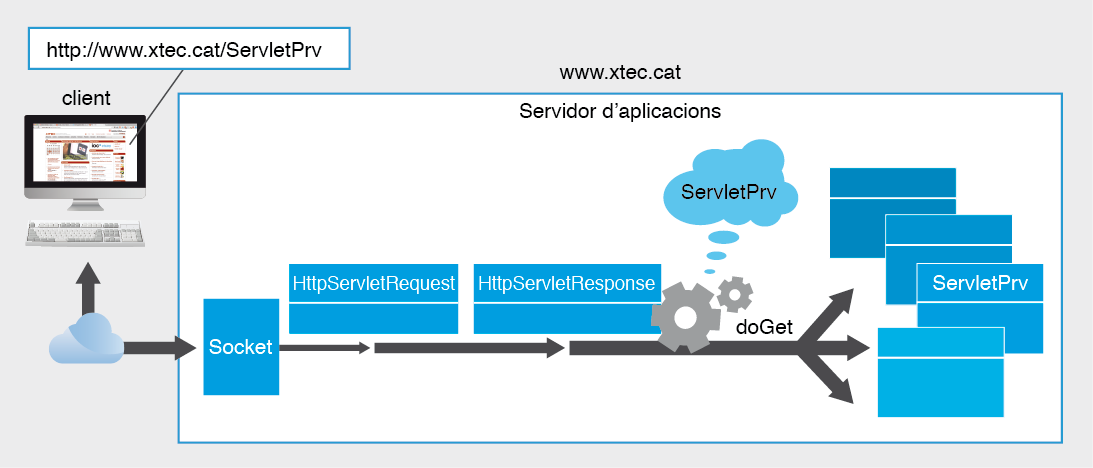 Un servidor d’aplicacions pot contenir molts servlets, d’aquí que habitualment se’l coneix com a contenidor. Quan arribi una petició d’un client, el contenidor la llegirà i guardarà les seves dades en un objecte de tipus HttpServletRequest. També crearà una objecte de tipus HttServletResponse preparat per gestionar l’enviament de la resposta al client. Finalment analitzarà la URL per reconèixer el nom del servlet al qual caldrà invocar (vegeu la figura). Si ja existeix en memòria, una instància del servlet demanat (degut a peticions anteriors) executarà el mètode adequat d’aquesta instància. Si a la memòria no hi hagués encara cap instància del servlet, el servidor d’aplicacions en crearà una i seguidament executarà el mètode. Per agilitzar el procés de crida, els servlets invocats solen deixar-se en memòria mentre hi hagi prou espai i el rendiment sigui òptim. En situacions crítiques, el servidor d’aplicacions pot decidir eliminar les instàncies d’aquells servlets menys populars o dels que faci més temps que no es rebi una petició.