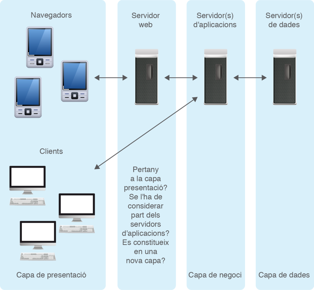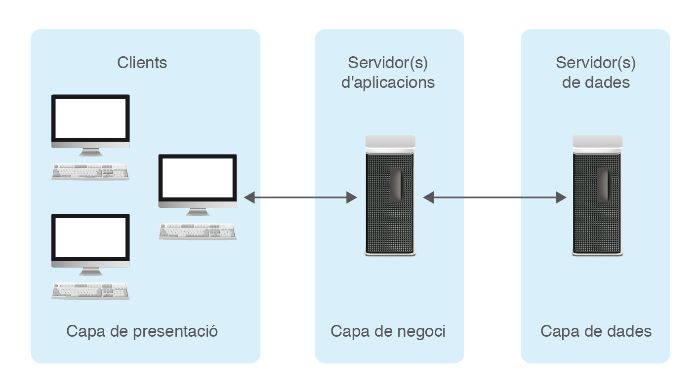 Per aquest motiu, s’adopta ben aviat l’arquitectura de tres capes (presentació-negoci-dades) il·lustrada a la figura, en la qual els clients tenen aplicacions senzilles que únicament presenten les dades subministrades per un o diversos servidors d’aplicacions, contenidors de la capa de negoci, que confeccionen aquelles dades a partir de la informació subministrada pels servidors de la capa de dades.