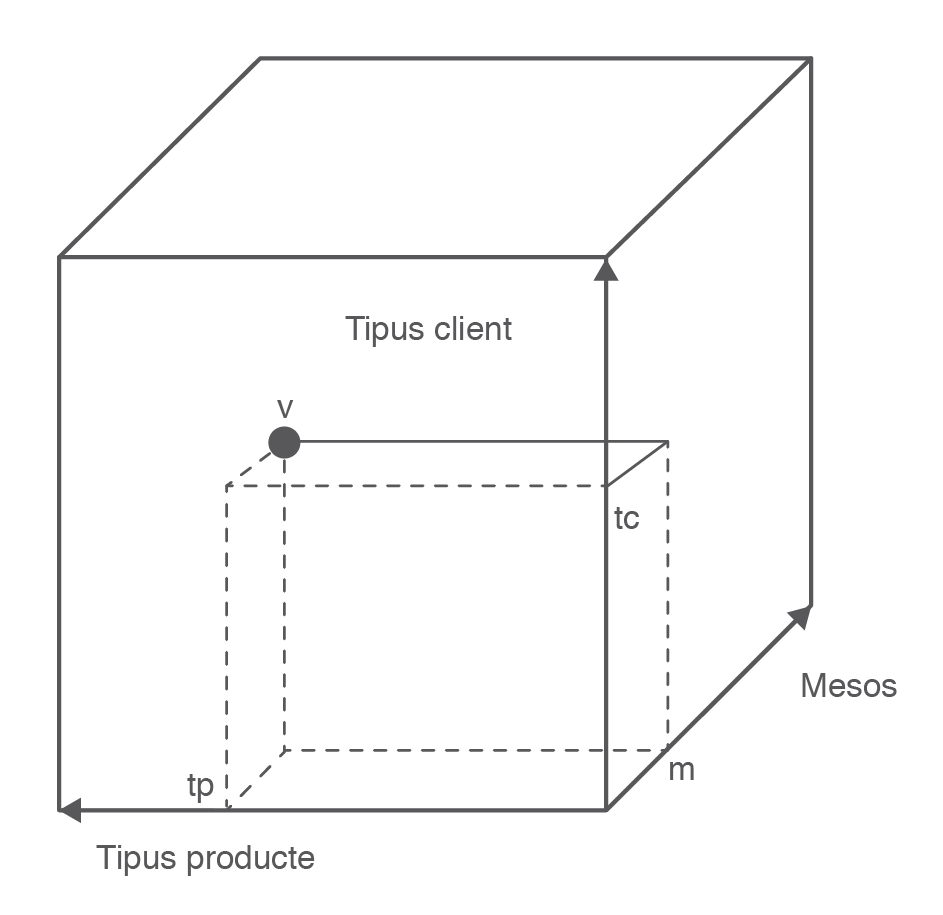 Així, si volem analitzar la quantitat de vendes per tipus de producte, tipus de client i mesos, podem construir el cub tridimensional de la figura. Observem que en el punt v hi haurà el valor corresponent a la quantitat de venda del tipus de producte tp efectuada per clients del tipus tc en el mes m.