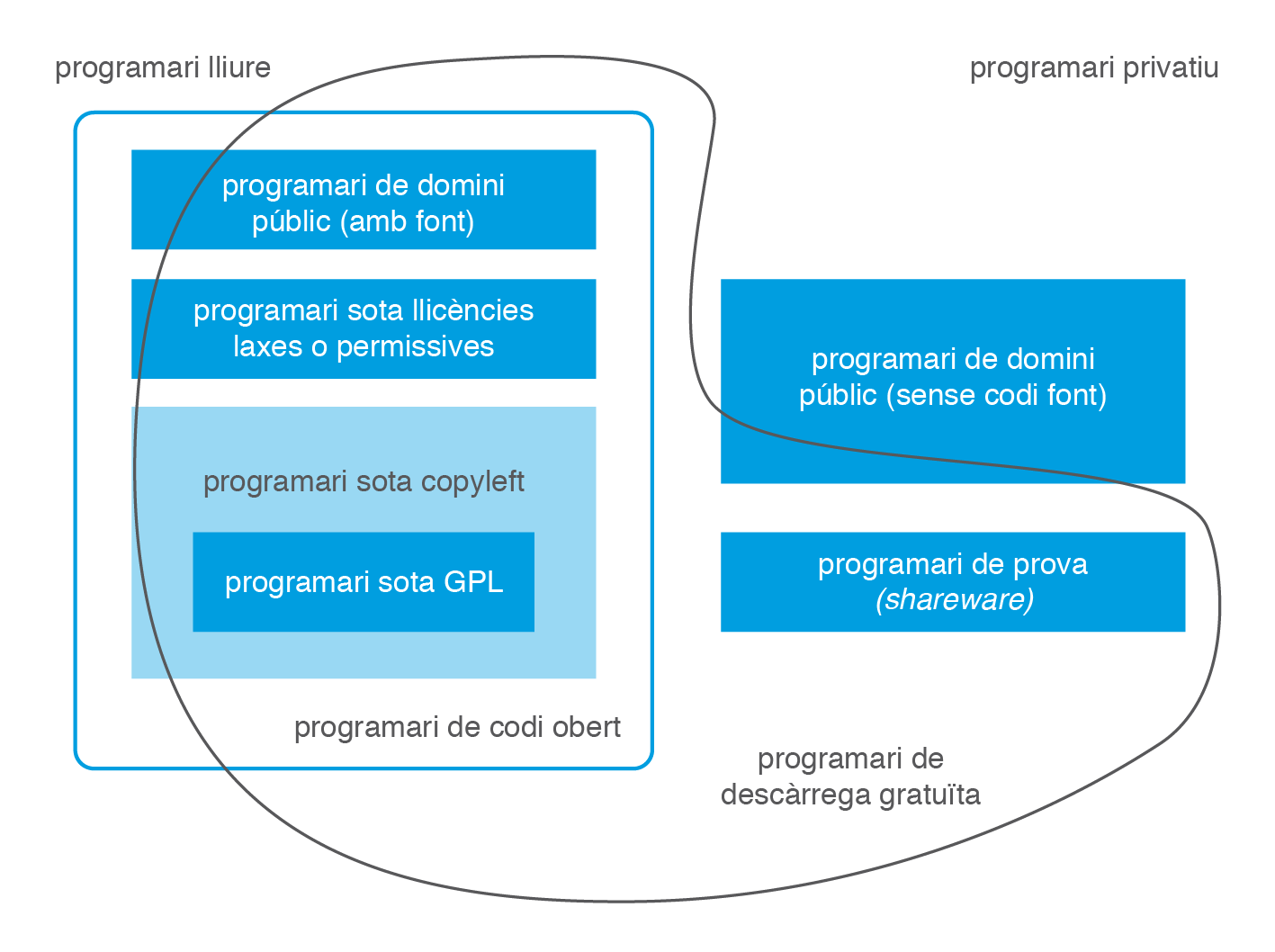 La distinció dels conceptes programari lliure, programari privatiu i codi obert és el primer pas per categoritzar un programari, però ens manca conèixer més conceptes utilitzats actualment. La figura, original de Chao-Kuei i posteriorment actualitzada per altres, situa les diferents categories del programari, que ens cal identificar: