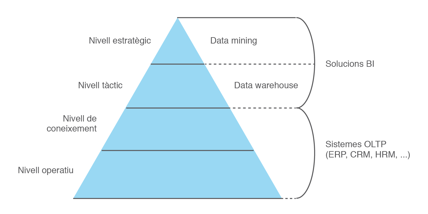 La figura mostra la correspondència entre els nivells jeràrquics d’organització d’una empresa i els tipus de sistemes de gestió de la informació normalment emprats, tenint en compte les necessitats d’informació de cada nivell. El contingut de la figura no s’ha de prendre al peu de la lletra; és a dir, els actors dels nivells estratègic i tàctic poden utilitzar informes facilitats pels sistemes OLTP i els actors del nivell del coneixement poden també utilitzar algun informe proporcionat per les eines BI externes als sistemes OLTP.