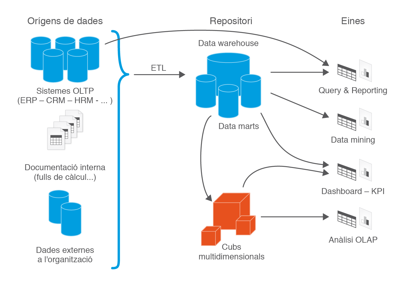 La figura incorpora conceptes (OLTP, data mining, data warehouse) que hem de reconèixer juntament amb d’altres que estan vinculats al món BI: ETL, OLAP, KPI, data mart, dashboard i cubs multidimensionals.
