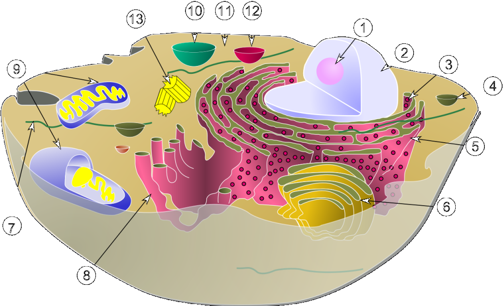 - Cèl·lules eucariotes: són cèl·lules més complexes (vegeu la figura) i més grans que les procariotes (10-100 µm) i pròpies d’organismes més complexos, generalment pluricel·lulars (com els animals i els vegetals), encara que també en podem trobar d’unicel·lulars (com els protozous i els llevats). Són cèl·lules que disposen de nucli cel·lular definit, ja que tenen membrana nuclear. El seu material genètic, responsable de l’herència biològica, es troba al nucli. Contenen molts orgànuls diferents, com ribosomes, cilis o flagels, a més de reticle endoplasmàtic, aparell de Golgi, mitocondris, centríols i lisosomes. Segons el seu origen, hi ha cèl·lules animals i vegetals (que es diferencien respecte de les anteriors perquè posseeixen una paret vegetal rígida, amb grans vacúols i cloroplasts).